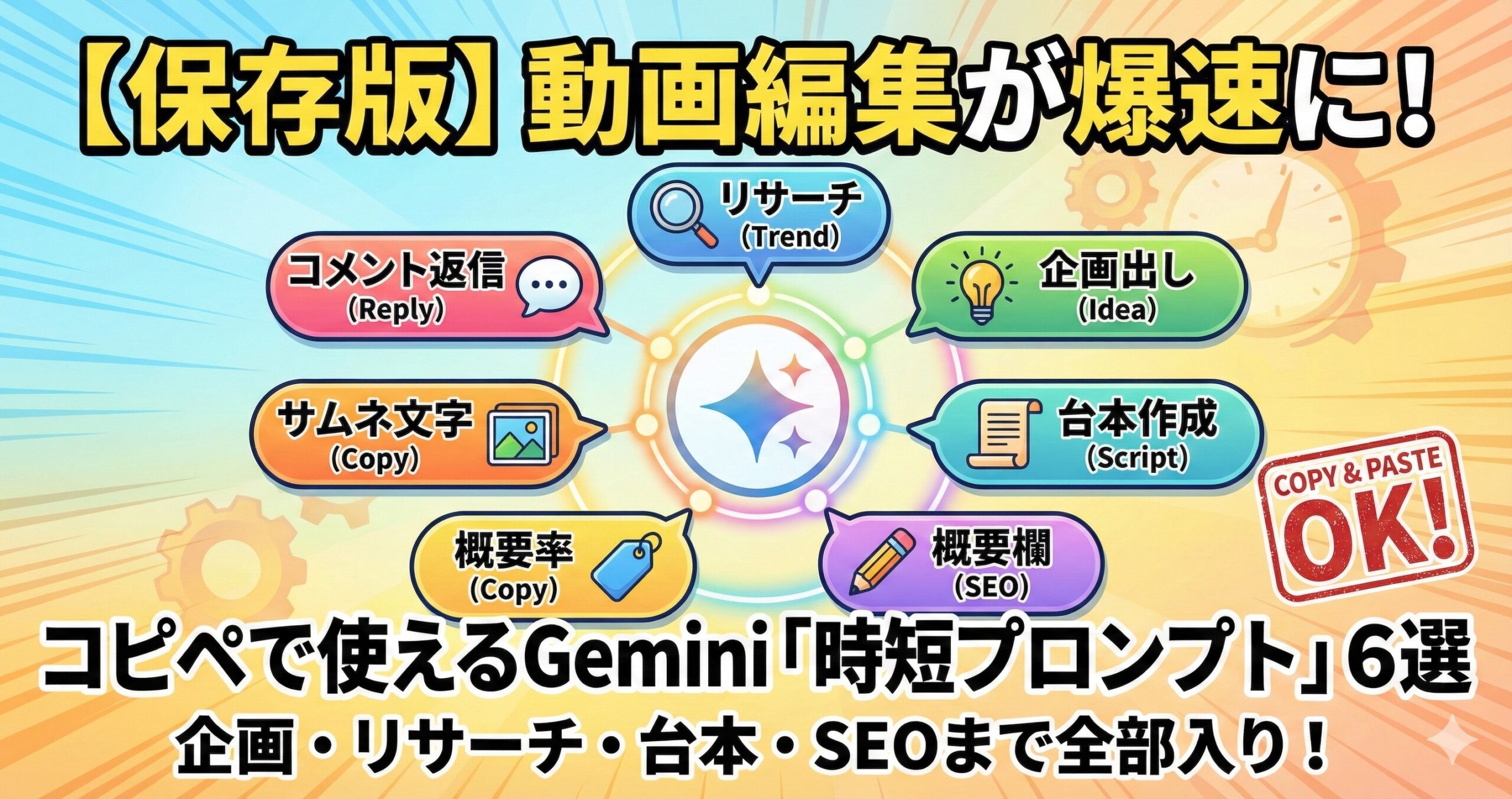 サムネイルの画像は決まったけど、入れる「文字(コピー)」が決まらない時に。 短い文字数でインパクトを出すのはGeminiの得意技です。