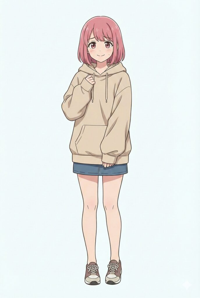 先ほど設定したキャラクター(ピンク髪、ベージュパーカー)が登場する、以下のシーンの画像を描いてください。
